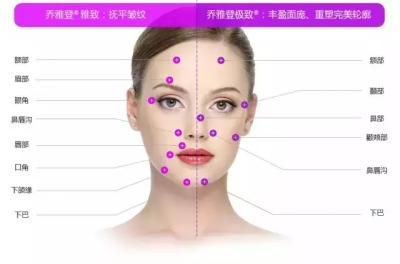 乔雅登?极致-立体感强更适合轮廓重塑,如隆鼻、隆下巴、丰太阳穴、苹果肌、丰额头等。乔雅登?雅致-柔滑细腻更适合除皱,可去除鱼尾纹、嘴角纹、额纹、鼻唇沟等中重度皱纹。